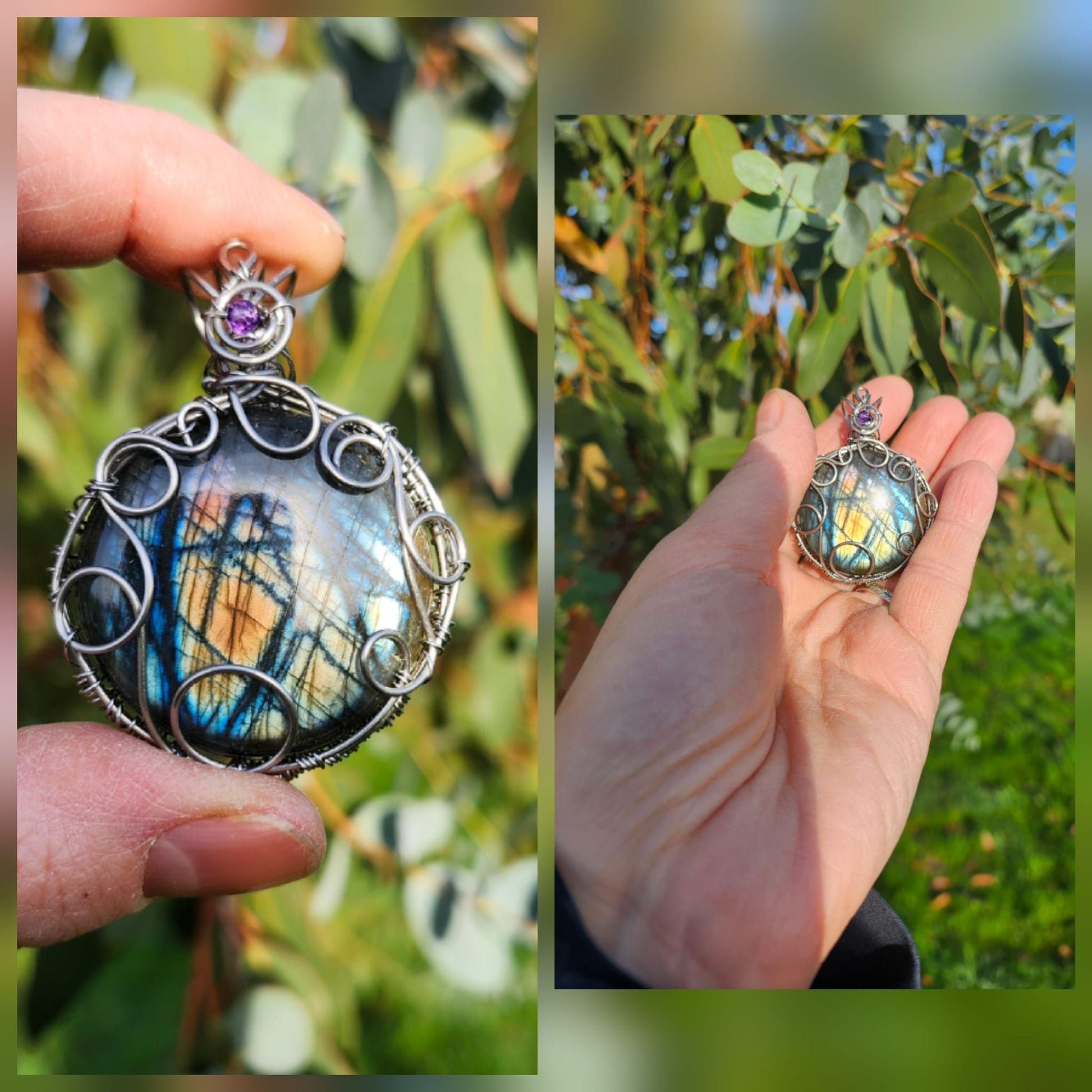 Sa Labradorite, traversée de reflets bleus et violets, mais embrasée par des nuances d’or et d’orange, incarne cette rencontre rare entre lumière et obscurité.