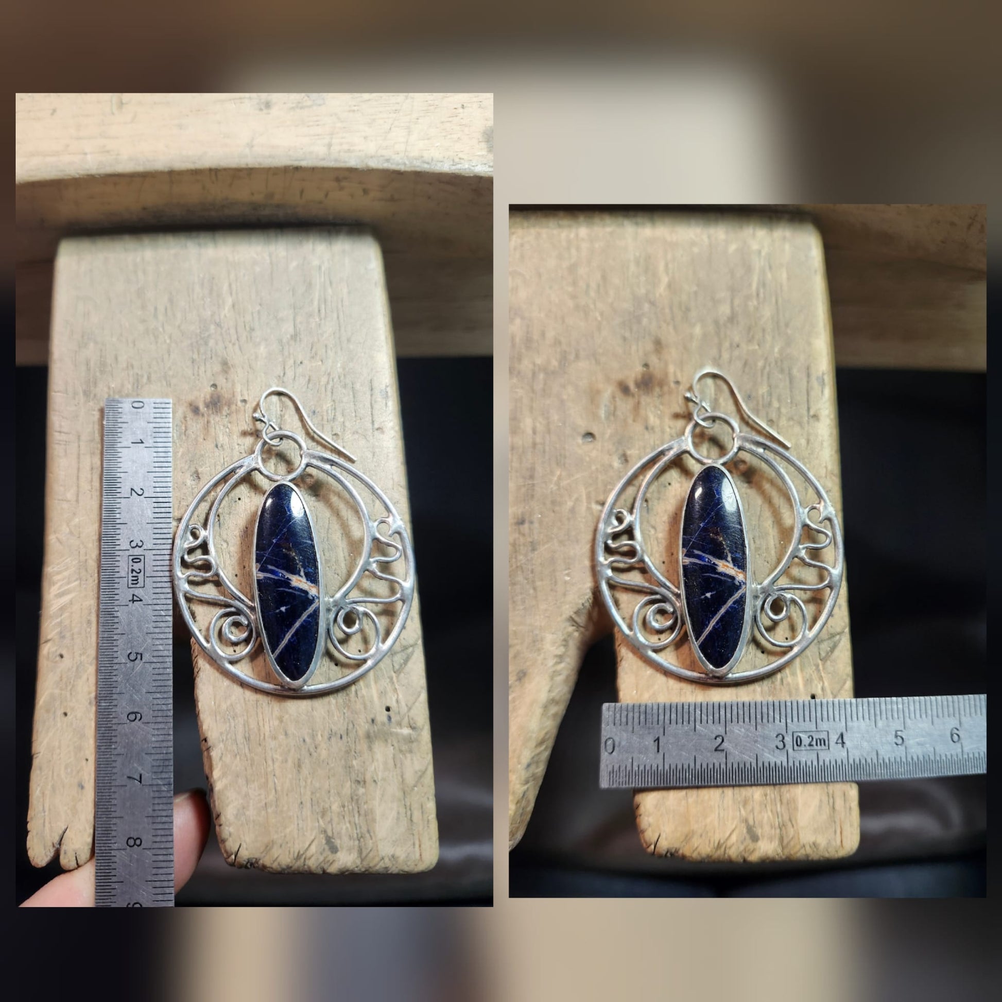 Paire de boucles d’oreilles faites à la main en argent massif, ornées de superbes sodalites de qualité supérieure intitulée « Les Boucles du Vent d’Automne »